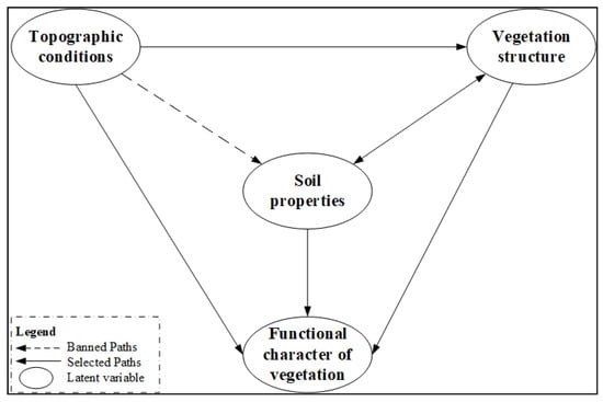If CCA results between the two sets of variables are not significant, we conclude there is no latent path between the two pairs in model. Therefore, we preliminarily determined the path of the PLS-SEM based on CCA results of different variable groups by eliminating a path from topographic conditions to soil properties. The following figure describes the optimized secondary structure equation model (Figure 5).