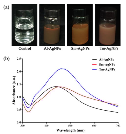 The synthesis of Al-AgNPs, Sm-AgNPs and Tm-AgNPs. (a) The color changes in the solutions. (b) UV-Visible spectroscopy.