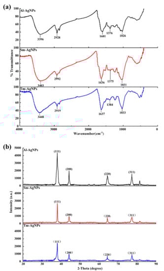 Characterization analysis of Al-AgNPs, Sm-AgNPs and Tm-AgNPs. (a) FTIR analysis (b) XRD analysis.