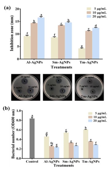 The AgNPs biosynthesized by three plants showed good in vitro antagonistic activity against Xoo strain C2 in Semi-solid agar media (Figure 4a). Indeed, the bacterial growth inhibition zone was clearly observed. When the concentration of three kinds of AgNPs were 5, 10, and 20 μg/mL, the diameters of inhibition zones generated by Al-AgNPs were 9.1 mm, 14.1 mm, and 16.5 mm, respectively, and those generated by Sm-AgNPs were 8.6 mm, 13.4 mm, and 14.5 mm, respectively. The diameters of inhibition zones produced by Tm-AgNPs were 4.2 mm, 11.1 mm, and 12.4 mm, respectively. Similarly, Ulagesan et al. [50] discovered that the inhibition zone produced by AgNPs in the solid culture of Pseudomonas aeruginosa is related to the concentration. The higher the concentration, the larger the inhibition zone.
