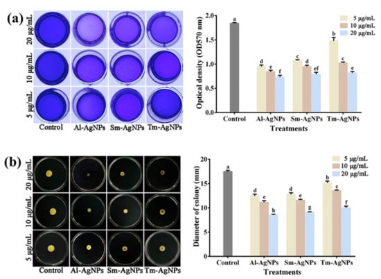 Biofilm formation is essential for the attachment, colonization, virulence, and antibiotic resistance of plant pathogens [53]. The results indicated that the three AgNPs synthesized by different plants strongly inhibited bacterial biofilm formation (Figure 5a). The OD570 values represents the amount of biofilm formation. Indeed, Al-AgNPs, Sm-AgNPs, and Tm-AgNPs at 5 μg/mL led to 48.70%, 41.59%, and 20.53% reduction in the OD570 values of Xoo strain C2, respectively. In addition, Al-AgNPs, Sm-AgNPs, and Tm-AgNPs at 10 μg/mL decreased the OD570 values of Xoo strain C2 by 55.08%, 48.53%, and 45.00%, respectively, while 20 μg/mL Al-AgNPs, Sm-AgNPs, and Tm-AgNPs attenuated biofilm formation at 60.41%, 57.3%, and 56.14%, respectively. In agreement with the antibacterial effect, the reduction of biofilm formation is related to the kind and concentration of AgNPs. Thus, we conclude that the antibacterial activity of three biosynthesized AgNPs may be partially due to their inhibition in biofilm formation. Similarly, Hossain et al. [54] found that AgNPs could reduce biofilm formation of Pseudomonas rhodesiae.