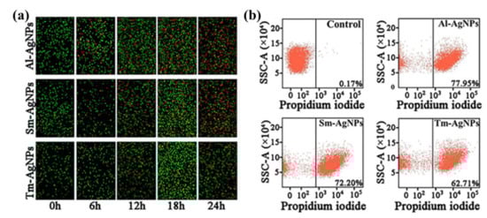 Direct killing effect of Al-AgNPs, Sm-AgNPs and Tm-AgNPs on Xoo strain C2 (a) Live/dead cell staining analysis. (b) Flow cytometry analysis.