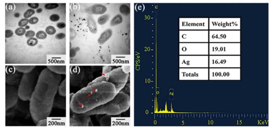 Ultrastructural observation of Xoo strain C2 after 24 h treatment with/without 20 µg/mL Al-AgNPs. (a) TEM images of bacterial without Al-AgNPs. (b) TEM images of bacterial with Al-AgNPs. (c) SEM images of bacterial without Al-AgNPs. (d) SEM images of bacterial with Al-AgNPs. (e) EDS analysis of bacteria treated with Al-AgNPs.