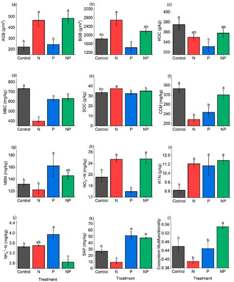 Effects of nitrogen and phosphorus addition on ecosystem parameters (M ± SE, n = 5), including (a) aboveground biomass (AGB); (b) belowground biomass (BGB); (c) roots organic carbon (ROC); (d) microbial biomass carbon (MBC); (e) soil organic carbon (SOC); (f) cumulative carbon mineralization (CCM); (g) microbial biomass nitrogen (MBN); (h) soil nitrate nitrogen (NO3−−N); (i) roots total nitrogen (RTN); (j) soil ammonia nitrogen (NH4+−N); (k) soil available phosphorus (SAP); (l) ecosystem multifunctionality (EMF). Different letters indicate that the same index has significant differences between different treatments (p < 0.05). Abbreviations: Control, the control without any nutrient addition; N, N-alone addition; P, P-alone addition; NP, N and P together addition.