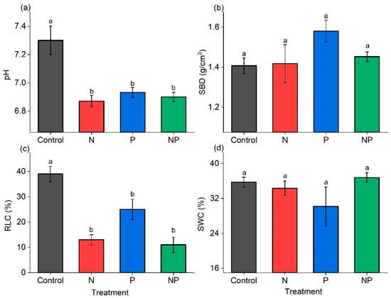 Effects of nitrogen and phosphorus addition on abiotic factors (M ± SE, n = 5), including (a) soil acidity and alkalinity (pH); (b) soil bulk density (SBD); (c) relative light conditions (RLC); (d) soil water content (SWC). Different letters indicate that the same index has significant differences between different treatments (p < 0.05). Abbreviations: Control, the control without any nutrient addition; N, N-alone addition; P, P-alone addition; NP, N and P together addition.