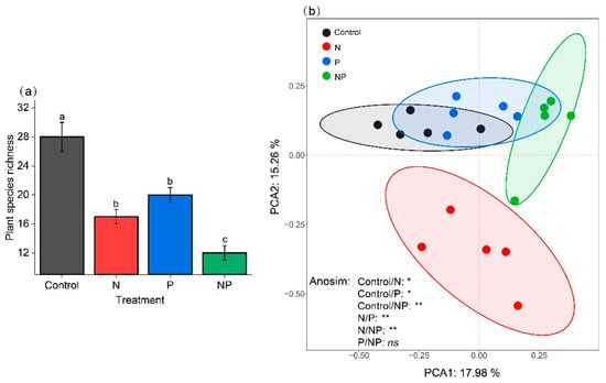 Effects of nitrogen and phosphorus addition on plant species richness (M ± SE, n = 5) and community composition, including (a) plant species richness; (b) plant community composition based on principal component analysis (PCA); and analysis of similarities (Anosim). Different letters indicate that the same index has significant differences between different treatments (p < 0.05). *, **, and ns indicated p < 0.05, p < 0.01, and p > 0.05, respectively. Abbreviations: Control, the control without any nutrient addition; N, N-alone addition; P, P-alone addition; NP, N and P together addition.