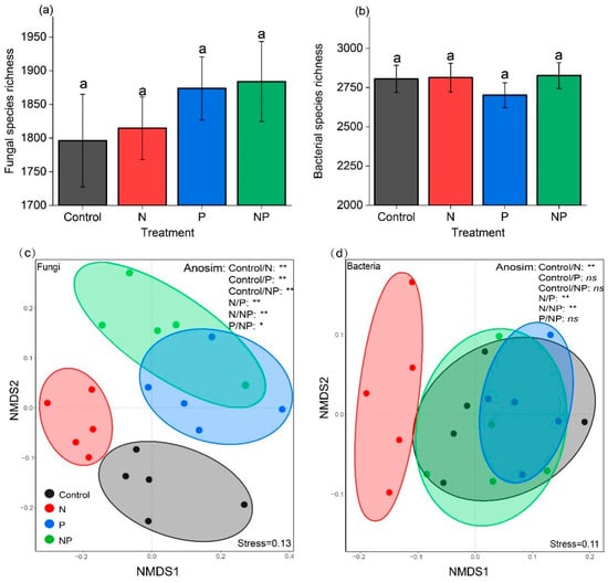 Effects of nitrogen and phosphorus addition on microbial species richness (M ± SE, n = 5) and community composition on operational taxonomic units (OTUs), including (a) fungal species richness; (b) bacterial species richness; (c) fungal community composition based on non-metric multidimensional scaling (NMDS) and analysis of similarities (Anosim) (d) bacterial community composition based on NMDS and Anosim. Different letters indicate that the same index has significant differences among different treatments (p < 0.05). *, **, and ns indicated p < 0.05, p < 0.01, and p > 0.05, respectively. Abbreviations: Control, the control without any nutrient addition; N, N-alone addition; P, P-alone addition; NP, N and P together addition.