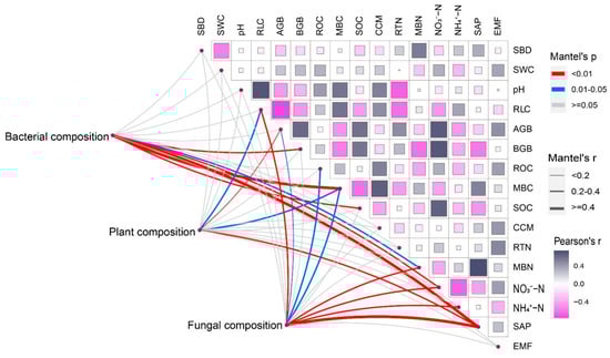 Mantel test analysis of ecosystem parameters and abiotic factors and plant and microbial composition on operational taxonomic units (OTUs). Abbreviations: pH, soil acidity and alkalinity; SBD, soil bulk density; SWC, soil water content; RLC, relative light conditions; AGB, aboveground biomass; BGB, belowground biomass; ROC, roots organic carbon; MBC, microbial biomass carbon; SOC, soil organic carbon; CCM, cumulative carbon mineralization; RTN, roots total nitrogen; MBN, microbial biomass nitrogen; NO3−−N, soil nitrate nitrogen; NH4+−N, soil ammonia nitrogen; SAP, soil available phosphorus; EMF, ecosystem multifunctionality.