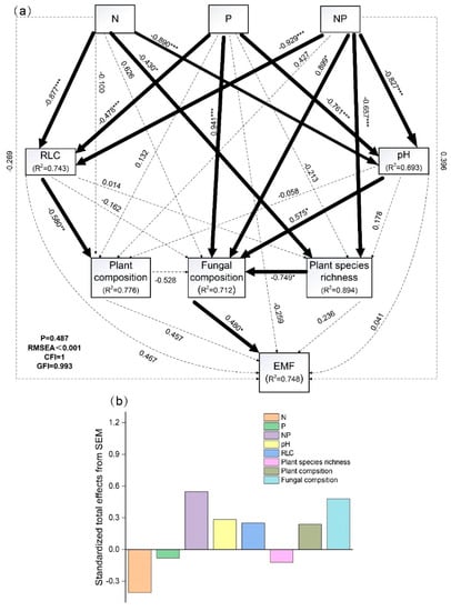 Structural equation model (SEM) of the effect of nitrogen and phosphorus addition on ecosystem multifunctionality, including (a) structural equation model; (b) standardized total effects from SEM. The solid line represents the path with significant influence (*, **, and *** indicated p < 0.05, p < 0.01, and p < 0.001, respectively), the dotted line represents the path with no significant influence, the number on the solid and dotted line represents the standardized path coefficient, and the R2 value represents the proportion of variation explained by causal relationships with other variables. Abbreviations: Control, the control without any nutrient addition; N, N-alone addition; P, P-alone addition; NP, N and P together addition; pH, soil acidity and alkalinity; RLC, relative light conditions; EMF, ecosystem multifunctionality; P, probability level; RMSEA, root mean square error of approximation; CFI, Comparative fit index; GFI, goodness-of-fit index.