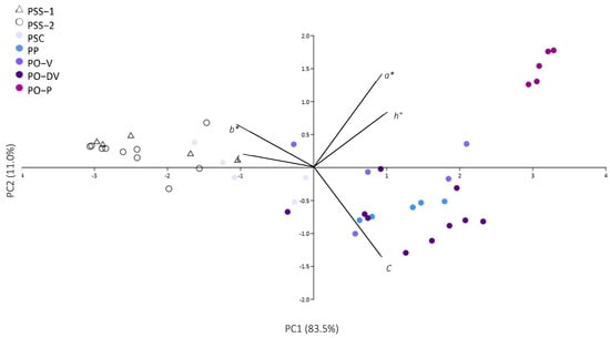 Last, blue-colored PP showed very similar colorimetric variables as violet-colored PO-V and PO-DV, and are distant from both purple-colored PO-P and white PSS. However, it showed a significantly higher presence of blue (more negative b values) than light violet PSC.