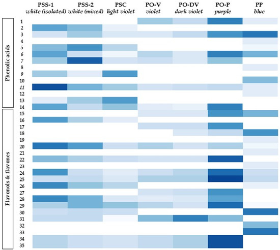 Although there was no difference in the phenolic profile or contents of individual phenolics between violet and dark violet flowers (PO-V and PO-DV), there was a different phenolic profile in light violet (PSC) flowers. Some compounds varied with violet intensity, either increasing (e.g., compounds 25, 31 and 34) or decreasing (e.g., compounds 11 and 14).