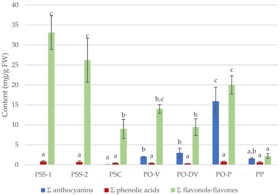 Although there was no difference in total values of phenolic acids among species or colors, significant differences were detected in total flavonols–flavones and anthocyanins contents among populations (Figure 4).