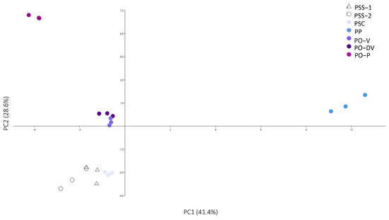 Considering all phenolic groups (anthocyanins, phenolic acids and flavonols–flavones), the complete phenolic profile showed low intra-population variability (Figure 5). It clearly separated into 4 groups: (1) PP, (2) PO-3, (3) PO-V and PO-DV, and (4) PSS-1 and PSS-2. However, PO-V and PO-DV in group 3 were not so clearly separated, as well as PSS-1 and PSS-2 in group 4. The phenolic compounds that influenced the distribution along PC1 the most were phenolic compounds number 4, 15, 8, 10, 12, 18, 19, 21, 22, 23, 28, 29, 30, 32 and 33, and anthocyanins 4 and 7 (Table 2, Table 4 and Table S2). These compounds were mainly the ones that were exclusive to PP or whose amounts were very different in PP compared to the other populations. In PC2, the most important compounds were numbers 1, 3, 5, 15, 9, 17, 13, 25, 27, 34 and 35, and anthocyanins 2 and 6 (Table 2, Table 4 and Table S2). These compounds were absent in PO, exclusive to it, or whose amounts were very different in PO compared to the other populations.