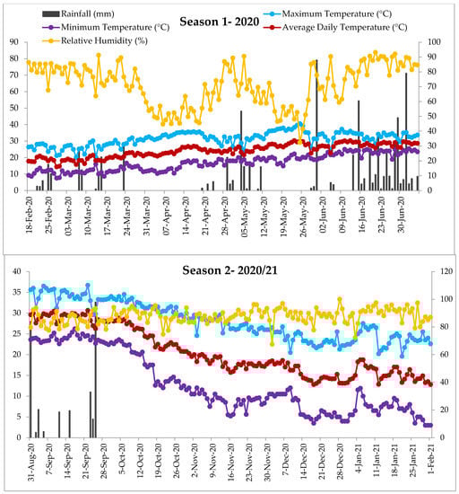 Agro—meteorological parameters recorded during season-1 (2020) and season-2 (2020/21). Daily rainfall (bar, black), minimum (purple line with markers), average (dark red line with markers), and maximum temperature (light-blue line with markers) are represented in the primary vertical axis, whereas relative humidity (Orange line with markers) is represented through the secondary vertical axis. The date is presented in day-month-year format where tail digit 20 (as in 1 September 2020) and 21 (as in 26 January 2021) indicate years 2020 and 2021, respectively. Meteorological data were obtained from the nearest meteorological station (Mehelkuna site) of the office of hydrology and meteorology.