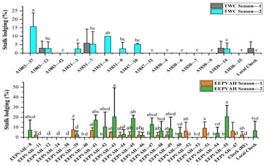 Stalk lodging recorded from maize genotypes of EEPVAH and TWC trials conducted in two contrasting seasons. Similar statistical letters for a season indicates non-significant effect, genotypes having only statistical letters and without a visible bar indicates no report of stalk lodging (zero lodging). Error bar reports only the positive values.