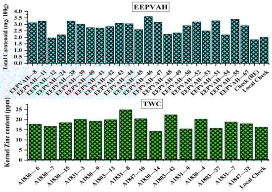 Total carotenoid in EEPVAH genotypes ranged between 1.8 and 3.6 mg 100 g−1 while TWC genotypes had between 14.2 and 24.9 mg kg−1 (ppm) zinc in its kernels. Most of the hybrids in both the trials reported higher kernel—zinc and total carotenoid compared to the local check -DMH849 (Figure 4). The total carotenoid was highest in EEPVAH-46 (3.59 mg 100 g−1) followed by EEPVAH-55 (3.4 mg 100 g−1) and EEPVAH-51 (3.3 mg 100 g−1), in contrast, total carotenoid was ≤2 mg 100 g−1 in local check, EEPVAH-12 and Check (RE) genotypes (Figure 4). Three-way cross hybrid maize genotype A1831-8 reported the highest kernel zinc content (24.86 ppm) while DMH849 (local check), A1803-37, A1831-9, and A1830-14 had kernel—zinc content ≤ 16.5 ppm. It was observed that EEPVAH and TWC biofortified maize hybrids had 9.5 to 79.5%, and 2.5 to 52.3% higher total carotenoid and kernel—zinc content, respectively, compared to the local check (Figure 4).