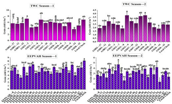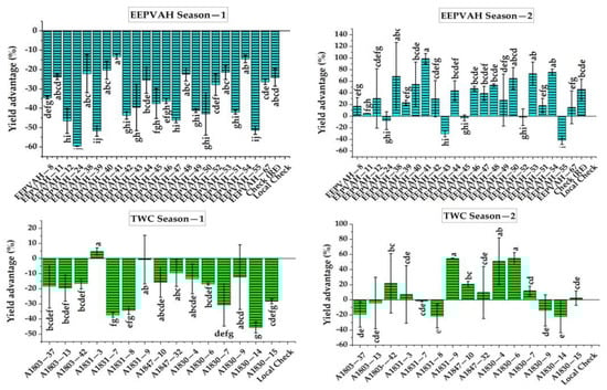 Yield advantage of TWC and EEPVAH genotypes over the local check recorded from two contrasting seasons. The downward bar indicates a negative yield advantage over the grain yield of the local check (DMH849). Similar statistical letters among the genotypes within the season indicates non-significant effect.