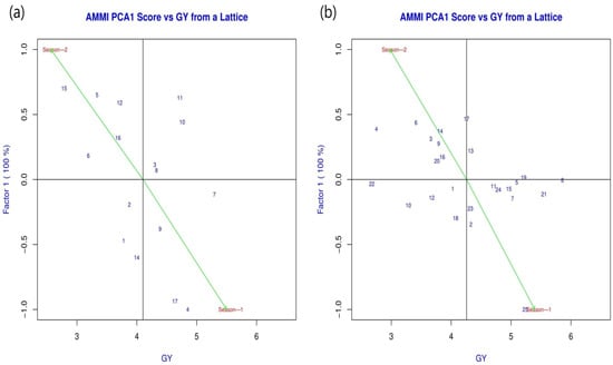 AMMI analysis of the grain yield trait of the maize genotypes from the two maize trials conducted under the contrasting seasons; figure (a) represents AMMI analysis of three way cross zinc biofortified hybrid maize genotypes, and figure (b) represents AMMI analysis of the regional extra early provitamin A biofortified hybrid maize genotypes, GY—grain yield (t ha−1). The numerical value in the figure indicates respective entry numbers of the genotypes, the name of which can be retrieved from Table 1.
