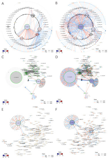 To construct the gene regulatory network driven by OsMADS58, we focused on the differentially expressed genes between the wild type and OsMADS58 expression perturbation (osmads58 dSpm and osmads58 CRISPR, respectively). The regulation edges where both transcription factors and corresponding target genes are differentially expressed were extracted from the regulation data in PlantRegMap [27]. Meanwhile, the regulation edges between OsMADS58 and its direct target genes identified by ChIP-seq [12] were obtained. These two types of regulation edges were merged into putative regulatory interactions. Considering that the downstream genes of OsMADS58 are supposed to be regulated due to a change in OsMADS58 expression, we only retained the regulatory interactions where the TF and corresponding target genes showed a strong (positive or negative) expression correlation across all samples (Figure 8A,B). The result showed distinct patterns in gene regulation generated in these two mutant lines (osmads58 dSpm and osmads58 CRISPR). For example, for the direct target genes of OsMADS58, there were more upregulated genes than downregulated ones in the osmads58 dSpm line, i.e., 110 genes were upregulated in the osmads58 dSpm line over wild-type levels, while only 24 genes were downregulated. This pattern is consistent to the severity of phenotypes of the two mutant lines described above.