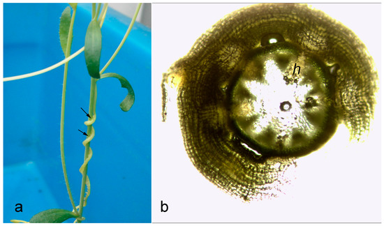 Point of infection of Arabidopsis thaliana by Cuscuta australis (a) with arrows, showing the site of haustoria formation after 24 h and microscopic cross-section of haustoria (h) after 72 h (b).