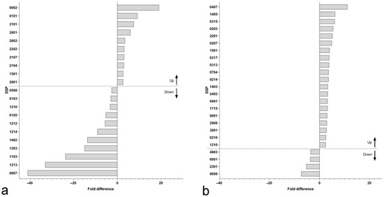 Differential protein abundance was assessed by two-dimensional polyacrylamide gel electrophoresis, separately in stem and leaves of the host plants. Images were analyzed using PDQuest 8.0 (Bio-Rad, Hercules, CA, USA) Software by deriving a master gel image (Figure 2a,b). Original images are provided as (Supplementary Figures S1–S4). Only protein spots with 2.5-fold difference between non-parasitized and parasitized samples, statistically significant at p < 0.05, Student’s t-test (Figure 2c,d) were considered for further analysis. A total of 21 proteins spots in leaves and 24 protein spots in the stem met the above criteria (Figure 3). Of them, the proportion of up-regulated to down-regulated protein spots were almost equal in leaves (Figure 3a), while in the stem (Figure 3b) the number of up-regulated protein spots was substantially higher than down-regulated (only four). The fold difference in leaves was also higher, reaching 40-fold down-regulation for SSP 0007 and above 20-fold for SSP 1213 and 1103 (Figure 2c and Figure 3a). The fold difference in stem was much lower for all of the protein spots (Figure 3b). All protein spots are indicated by their SSP number, automatically assigned by PDQuest 8.0 Software.