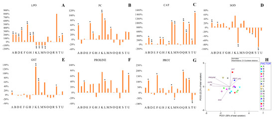 Biochemical parameters evaluated in rhizobacteria isolated from plants grown in Cabo Verde: (A) Lipid peroxidation, (B) Protein carbonylation, (C) Catalase, (D) Superoxide Dismutase, (E) Glutathione S-Transferase, (F) Proline, (G) Protein, (H) principal coordinates ordination of biochemical parameters under drought stress. Biochemical markers variation of bacterial cells exposed to PEG50 relatively to control (not exposed to PEG). Bacterial strains: Pantoea spp. (A); Klebsiella spp. (B); Pseudomonas spp. (D); Pseudomonas spp. (E); Acinetobacter spp. (F); Stenotrophomonas spp. (G); Enterobacter spp. (H); Enterobacter spp. (J); Pantoea spp. (K); Pseudomonas spp. (L); Rhizobium spp. (M); Paenarthrobacter spp. (N); Ochrobactrum spp. (O); Pseudomonas spp. (Q); Rhizobium spp. (R); Stenotrophomonas spp. (S); Pseudomonas spp. (T); Enterobacter spp. (U). Values are means of three replicates + standard deviation. Significant differences compared to non-inoculated watered plants (control) were marked with single asterisks (p < 0.05) or double asterisks (p < 0.01). For additional information (means, standard deviation and statistical significance) see supplementary Table S1.