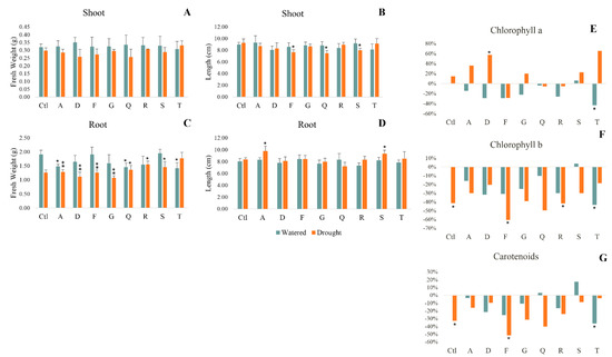 Maize plants grown for 7 days in watered and drought conditions. Morphometric parameters: fresh weight (A) and length (B) of shoots; fresh weight (C) and length (D) of roots. Variation of photosynthetic pigments relatively to control (watered and non-inoculated plants): chlorophyll a (E), chlorophyll b (F) ad carotenoids (G). Watered (greenish bars) and drought (orange bars) plants were inoculated with different strains: Pantoea spp. (A); Pseudomonas spp. (D); Acinetobacter spp. (F); Stenotrophomonas spp. (G); Pseudomonas spp. (Q); Rhizobium spp. (R); Stenotrophomonas spp. (S); Pseudomonas spp. (T). Values are means of three replicates + standard deviation. Significant differences compared to non-inoculated watered plants (control) were marked with single asterisks (p < 0.05) or double asterisks (p < 0.01). For additional information (means, standard deviation and statistical significance) see supplementary Table S2.