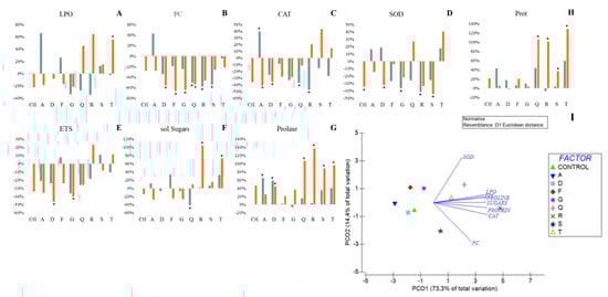 The PCO shows the effect of bacterial inoculation on the response of plants to drought stress. In the PCO (Figure 3H) it is observed that all parameters have high correlations, ranging from 0.88 to 0.98, with LPO and CAT having the highest values (0.97 and 0.98, respectively). The drought effects on non-inoculated plants (control), and plants inoculated with A and F positioned them on the negative side of PCO1 and PCO2 axes, showing low influence of bacterial inoculation on the biochemical changes plant underwent when exposed to drought. On the positive side of PCO1 and PCO2 axes it is observed the strain that influenced positively most parameters (R). Strains T and Q are close positively influencing mostly SOD and LPO. Strains F and G are positioned in the positive side of PCO2 and on the negative side of PCO1 axes, showing the ability to reduce protein carbonylation and to increase antioxidant response (SOD activity) under stress. S strain is positioned in the positive PCO1 and negative PCO2 axes evidencing the influence of this strain on the increase of PC on drought compared to watered plants. Strain R stands out by being positioned in the most positive value of PCO1 increasing CAT activity, soluble sugars accumulation and protein and proline content in plants as a response to water shortage.