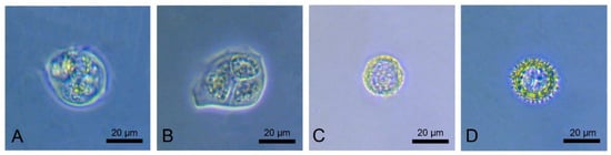 Stages of sunflower microspore development: (A) between meiotic dyad and tetrad; (B) tetrad of microspores; (C) early uninucleate microspore; and (D) late uninucleate microspore. Photographs were taken by authors of this review.