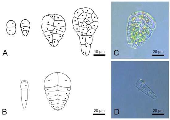 Similarity of gametic embryos and sunflower trichomes in vitro: (A) schematic of the developmental stages of a microspore-derived embryo; (B) schematic of the sunflower trichome morphology; (C,D) different morphologies of sunflower trichomes in a liquid medium. Photographs were taken by authors of this review.