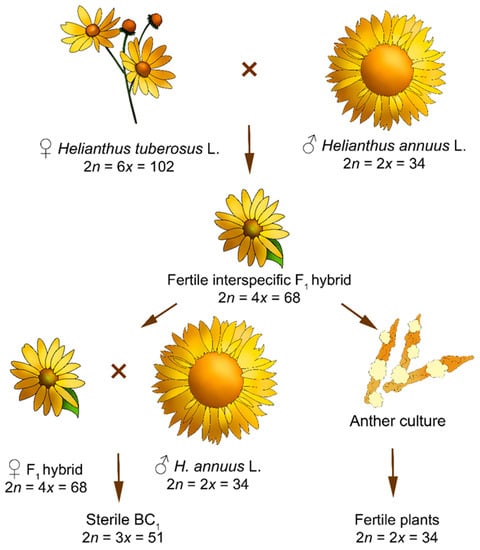 The polyploid series of the genus Helianthus includes diploids (2n = 2x = 34), tetraploids (2n = 4x = 68), and hexaploids (2n = 6x = 102). Different ploidy levels present certain difficulties in the distant hybridization of sunflower [6]. As for the doubled haploid technique, this approach makes it possible to decrease the ploidy levels of some wild species and interspecific hybrids without a loss of fertility [13,17]. Additionally, it facilitates interspecific hybridization during the introgression of valuable resistance genes from wild species [17]. An efficient protocol developed for the production of sunflower doubled haploids enhances the distant hybridization of species differing in their ploidy level to obtain sound, fertile, interspecific hybrids, as was achieved for potato [18].