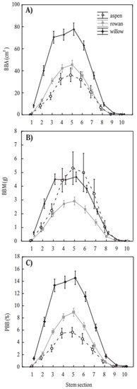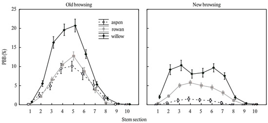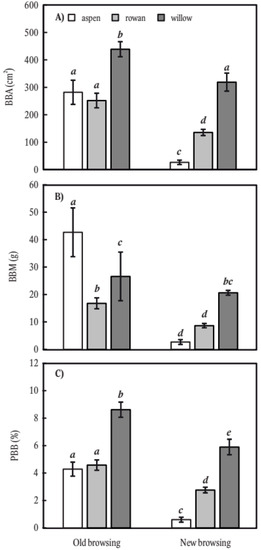 Our results indicated that stems of goat willow were the most intensively browsed by LWH, followed by common rowan and common aspen. The three tree species differed in all metrics of browsing (i.e., BBA, BBM, and PBB), except that willow and aspen had a similar BBM across a portion of the vertical stem profile. Although the area browsed on willow was higher than on aspen, aspen had a thicker bark (i.e., higher value of specific surface mass), so LWH were able to consume a great mass per unit area. Although each of these tree species is generally recognized as attractive for feeding by LWH [23,24,27,28,29], our results demonstrate a clear rank of selection. Our results indicate that goat willow is the most attractive species to LWH as manifested by the largest BBA and also PBB; at the same time, already, the small trees (diameter under 3 cm) in comparison with the other species were rather intensively browsed. The least browsed tree species (in both BBA and PBB) was aspen; however, it carries the most bark mass per area unit of stem surface accessible to LWH.