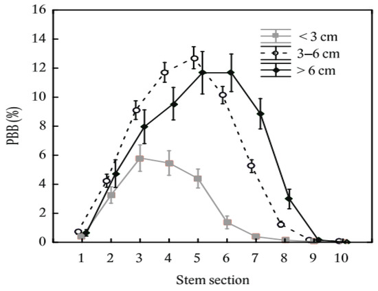 When examining browsing distribution along the vertical stem profile among diameter classes (Figure 5), we found that the distribution of the thinnest trees (<3 cm) was left-sided, the moderately thick trees were generally symmetrical and the thickest trees showed a right-sided distribution. Thus, maximum values of PBB were in the stem sections of 51–75 cm, 101–125 cm, and 126–150 cm in the order from the thinnest to thickest diameter class.