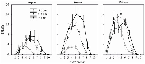 Stem bark browsing on common aspen (Populus tremula L.), common rowan (Sorbus aucuparia L.), and goat willow (Salix caprea L.) considering diameter classes of stems and stem sections. Stem browsing is expressed on relative basis (i.e., proportion of browsed bark mass to full bark mass potential). The error bars indicate standard errors. The stem sections are coded as 1: 0–25 cm, 2: 26–50 cm, 3: 51–75 cm, 4: 76–100 cm, 5: 101–125 cm, 6: 126–150 cm, 7: 151–175 cm, 8: 176–200 cm, 9: 2: 201–225 cm, and 10: 226–250 cm from the ground level.