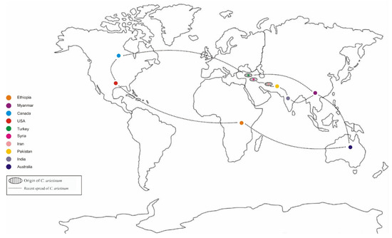 Origin of chickpea (C. arietinum) and its distribution around the world.