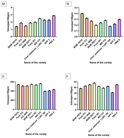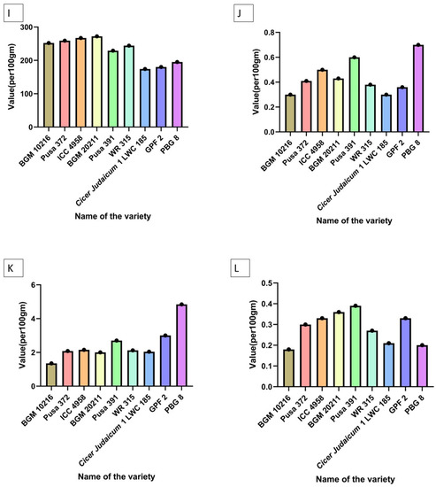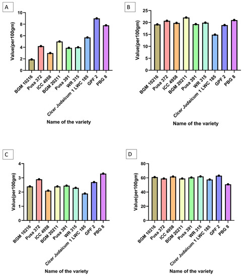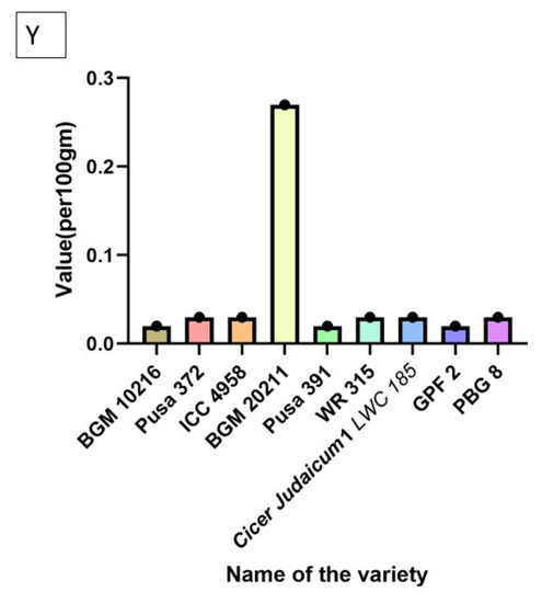 At ICRISAT, chickpea germplasm collection contains a total (>3500 accessions) whereas ICAR-NBPGR has (1500 accession), 2200 accession of whole genome sequenced, and 292 vastly diverse sets of collection and 223 superior halotypes [30]. New varieties are being developed every year to deal with the biotic and abiotic constraints of chickpea. As these constraints lead to the reduction of chickpea production by up to 90%. ICAR has released chickpea varieties Pusa 1105, and 2024 that are high-yielding and well-adaptable kabuli varieties while Pusa 362, 1103, 372, and BGD are well-adapted desi types. As per the annual report of IARI, several novel varieties have been developed in the year 2020 for biotic and abiotic constraints. Our research group has worked on two very newly developed and elite varieties of Chickpea (C. arietinum L.) i.e., Pusa Chickpea 20211 (aka Pusa Chickpea Manav) and PUSA 10216 that we have procured from IARI. The latter is a drought-tolerant variety that had been developed after the introgression of “QTL-hotspot” for drought tolerance in the ICC 4958 genotype of chickpea in the genetic background of Pusa—372 with the assistance of molecular markers. “Pusa Chickpea—10216” is moderately immune to fusarium wilt, stunt diseases, and dry root rot of chickpea with a mean grain yield of 1447 kg/ha under the moisture stress condition of the Central Zone of India. Its average weight is around 22.2 g per 100 seeds and matures in 110 days. Similarly, Pusa Chickpea Manav is also developed by the introgression of the “QTL-hotspot” from WR 315 into Pusa 391 for fusarium wilt resistance. It is high-yielding and disease-resistant (moderately resistant to pod borer, stunt, dry root rot and collar rot and highly resistant to fusarium wilt). Under wilt-stress conditions, it has a production potential of 3915 kg/ha and reaches maturity very quickly, in just 108 days. Its average weight is around 19.5 g per 100 seeds and with a protein content of 18.92 per cent. We have worked on the biochemical characterization of these two novel varieties of chickpea BGM 10216 and BGM 20211 and their respective parents i.e., Pusa 372, ICC 4958, WR 315 and Pusa 391. Several tests (crude fiber, crude protein, methionine, cysteine, riboflavin, β-carotene (vitamin A), omega 6: omega 3, uric acid, and protein bioavailability) were run on them to assess their nutritional profile. As a result of the comparative study (Figure 4), it can be concluded that both of these novel varieties have some advances over their parents but BGM 20211 has shown better results between these two newly developed ones.