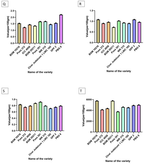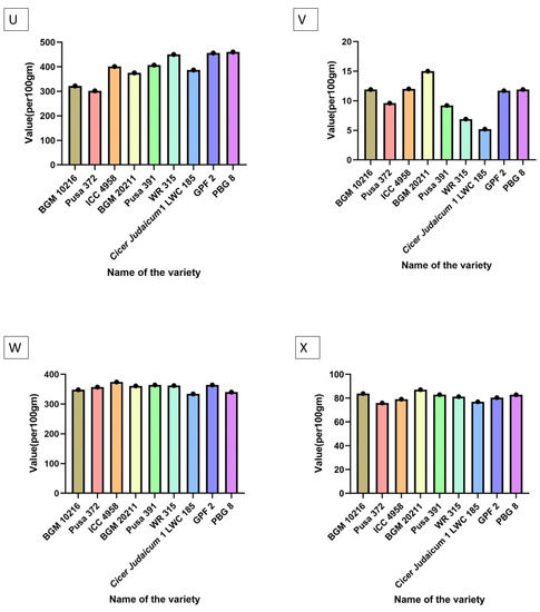 Biochemical tests of nine chickpea varieties (A) Crude Fiber content, (B) Crude protein content, (C) Total ash content (D) Carbohydrate content (E) Crude Lipid—Fat content (F) Methionine content (G) Arginine content (H) Lysine content (I) Cysteine content (J) Saturated fatty acids content (K) Polyunsaturated fatty acids content (L) Riboflavin content (M) Niacin content (N) Thiamin content (O) Folate content (P) β—carotene content (Q) Phenolic content (R) Flavonoid content (S) Omega 6: Omega 3 content (T) Antioxidant activity content (U) Lectin and hemagglutination activity (V) Uric acid content (W) Energy value content (X) Protein bioavailability (Y) Phytic acid content.