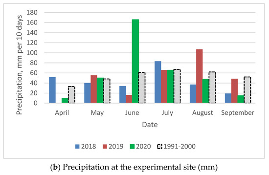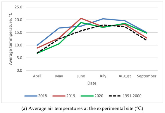 Weather data were collected at a stationary meteorological station located in Akademija using temperature and rainfall sensors (Figure 1). In 2018, the temperature of the growing season was higher than the average. In 2019, the temperature was higher than the perennial temperature during the vegetative phase and harvesting, but the precipitation was very uneven. In 2020, the temperature and precipitation decreased during the sowing period but increased during the vegetative phase.