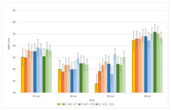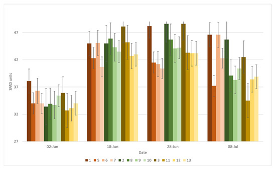 SPAD value of oat in different mixed cropping treatments, averaged over the three years, depending on the vegetation date. Note: 1, Pea Jūra DS; 2, Pea Egle DS; 3, Pea Lina DS; 4, Oat Viva DS; 5, Pea Jūra DS 50% + 50% oat; 6, Pea Jūra DS 60% pea + 40% oat; 7, Pea Jūra DS 70% + 30% oat; 8, Pea Egle DS 50% + 50% oat; 9, Pea Egle DS 60% pea + 40% oat; 10, Pea Egle DS 70% + 30% oat; 11, Pea Lina DS 50% + 50% oat; 12, Pea Lina DS 60% pea + 40% oat; 13, Pea Lina DS 70% + 30% oat.