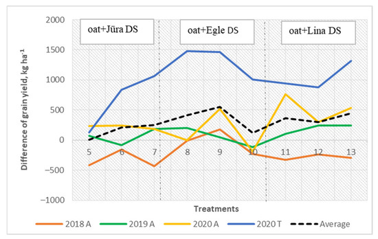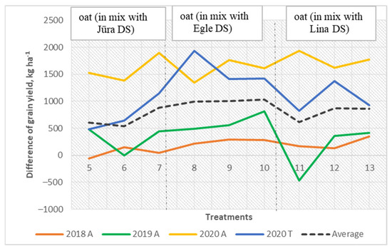 However, the grain yield of pea in the mixed cropping systems showed was higher with the new cultivar Lina DS (Figure 5). However, oat grain yield decreased when field pea yield was higher in the mixed cropping systems (Figure 6).