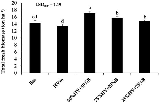 Among different green manures, the highest total fresh biomass yield (17.1 ton ha−1) was obtained in the 50%HV + 50%B intercropping. Moreover, the lowest total fresh biomass belonged to hairy vetch (HVm) and barley monoculture (Bm). The total fresh biomass in intercrops of 25%HV + 75%B, 50%HV + 50%B and 75%HV + 25%B was enhanced by 3.9, 19.1 and 9.3% in comparison with Bm and was enhanced by 11, 27.2 and 16.8% in comparison with HVm, respectively (Figure 1).