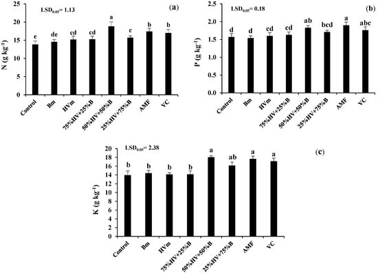 The maximum content of N (18.8 g kg−1) and K (18.1 g kg−1) in peppermint was recorded in green manure intercropping at the ratio of 50%HV + 50%B, which was 36.1 and 29.3% higher than the control, respectively. Moreover, the highest content of P (1.9 g kg−1) belonged to the AMF application followed by 50%HV + 50%B (1.8 g kg−1). The P content of peppermint increased by 1.9, 3.8, 16.6, 8.9, 21 and 12.1% by the application of HVm, 75%HV + 25%B, 50%HV + 50%B, 25%HV + 75%B, AMF and VC, respectively (Figure 2a–c).