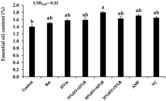 The essential oil content of peppermint in different fertilizer sources. Bm (Barley monoculture); HVm (hairy vetch monoculture); 50%HV + 50%B, 75%HV + 25%B and 25%HV + 75%B (different intercrop ratios of hairy vetch/barley); AMF (arbuscular mycorrhizal fungi); VC (vermicompost). Same letters above the bars do not differ significantly (p < 0.05) according to LSD test.
