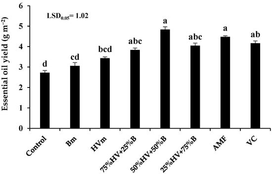 Similar to the EO content, application of 50%HV + 50%B green manure produced the highest EO yield of peppermint (4.84 g m−2). In contrast, the lowest EO yield (2.73 g m−2) was achieved in the control (non-fertilization). The application of Bm, HVm, 75%HV + 25%B, 50%HV + 50%B, 25%HV + 75%B green manures, AMF and VC enhanced the EO yield of peppermint by 12.1, 26, 40.7, 77.3, 48.3, 64.1 and 52.7%, when compared with non-fertilization, respectively (Figure 4).