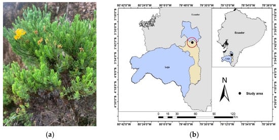 Fresh aerial parts (leaves, flowers, and stems) of H. laricifolium (Hypericaceae) (Figure 1b) were harvested in October 2020 from wild plants growing in “Ramos Urku”, Loja province, Ecuador (9588111 N, 692532 E coordinates, at an altitude of 2520 m a.s.l.). The plant was identified by the UTPL botanist Jose Miguel Andrade, and a voucher is deposited in the UTPL Herbarium with the accession code HUTPL11743. The plant material was harvested under permission from the Ministry of Environment of Ecuador (MAE) MAE-DBN-2016-048. Fresh harvested aerial parts were placed in jute bags and brought in about 40 min to the UTPL Chemistry Laboratory, where they were immediately steam-distilled.