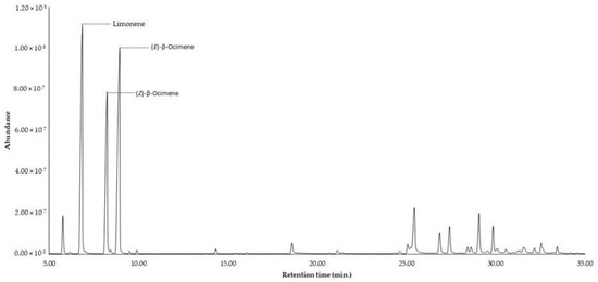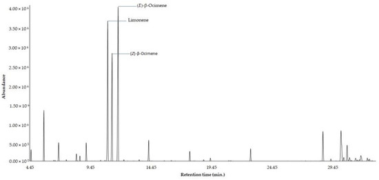 The major identified compounds (>10%) were limonene, (E)-β-ocimene, and (Z)-β-ocimene, with percentages on the total oil of 24.29, 21.89, and 12.88% on a non-polar DB-5ms capillary column, and 23.16, 27.15, and 16.03 %, on a polar HP-INNOWax capillary column, respectively.
