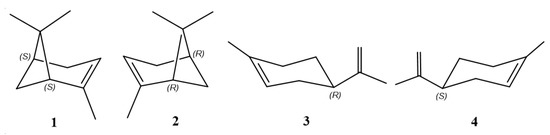 Enantiomeric pairs detected by GC enantioselective analysis of the H. laricifolium EO: (1S,5S)-(-)-α-pinene (1), (1R,5R)-(+)-α-pinene (2), (R)-(+)-limonene (3), (S)-(-)-limonene (4).