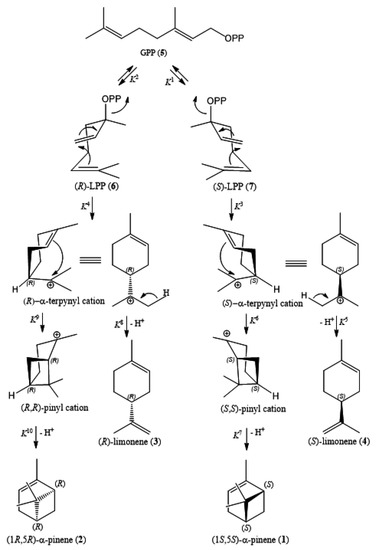 The results of the GC enantioselective analysis deserve a separate comment. In fact, the finding that a-pinene and limonene occurred in the EO as scalemic mixtures, although one enantiomer predominated in each couple (Table 2), indicated that the biochemical machinery of Ecuadorian H. laricifolium contained two separate enzyme systems, each capable of elaborating on a single enantiomer [51]. Thus, the formation of the separate enantiomers of linalyl pyrophosphate (LPP), (R)-6 and (S)-7, from geranyl pyrophosphate (GPP) (5), followed by analogous carbocation reactions, would explain the production of the couples of monoterpene enantiomers 1/2 and 3/4, as shown in Scheme 1. Moreover, the remarkable higher percent content in the EO of 1+4 than 2+3 (Table 2), which originated from each of the two LPP enantiomers, clearly indicated that K1 > K2 and/or K3 > K4. On the higher hand, the higher content of 4 compared to 1, and 2 compared to 3 (Table 2), which are formed from the corresponding α-terpynyl cation, demonstrated that K5 is greater than K6/K7, but K9/K10 are greater than K8 (Scheme 1). In conclusion, these findings clearly indicated that each step of the two biosynthetic pathways leading to 1-4 from GPP (5) was enzymatically controlled.