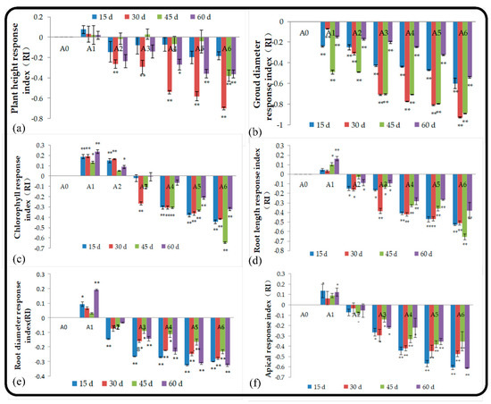 Figure 1a–c shows the growth status of the aboveground parts of seedlings. Lower concentrations (A1) of root extracts promoted the growth of seedlings (RI > 0), and higher concentrations resulted in stronger inhibition (RI < 0). The allelopathy of root extracts was the strongest at 30 d of seedling growth, especially for treatment A6, and the absolute value of RI reached 0.70. Any concentration of root extracts can significantly inhibit the growth of the ground diameter of seedlings The degree of inhibition increased as the concentration applied increased, and the RI value peaked on the 30th day and then decreased with time. A1 and A2 stimulated chlorophyll synthesis in the leaves, and lower concentrations were associated with stronger stimulation of chlorophyll synthesis. The inhibition of chlorophyll synthesis was highest in A6, and the average RI absolute value reached 0.46 within 60 d.