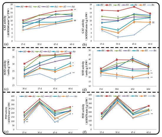 Many studies have shown that SOD activity increases under moderate stress levels to mediate adaptation to stress. The SOD activity of the root system of M. hupehensis Rehd. in the low-concentration root extract treatment and the control treatment increased with treatment time, and the SOD activity of the root system of M. hupehensis Rehd. in the high-concentration root extract treatment decreased at 45 d (Figure 3c). Treatments A1 and A2 increased the activity of SOD in the roots in the first 45 d, and treatments A4, A5, and A6 significantly decreased the activity of SOD in the roots by 26.5%, 29.4%, and 45.6%, respectively, at 45 d. B1, B2, and B3 promoted increases in SOD activity in the first 30 d, but as the stress treatment time extended, SOD activity decreased. Treatments B5 and B6 significantly inhibited the SOD activity of roots from the beginning of the experiment, and the degree of inhibition increased with the treatment time (Figure 3d).